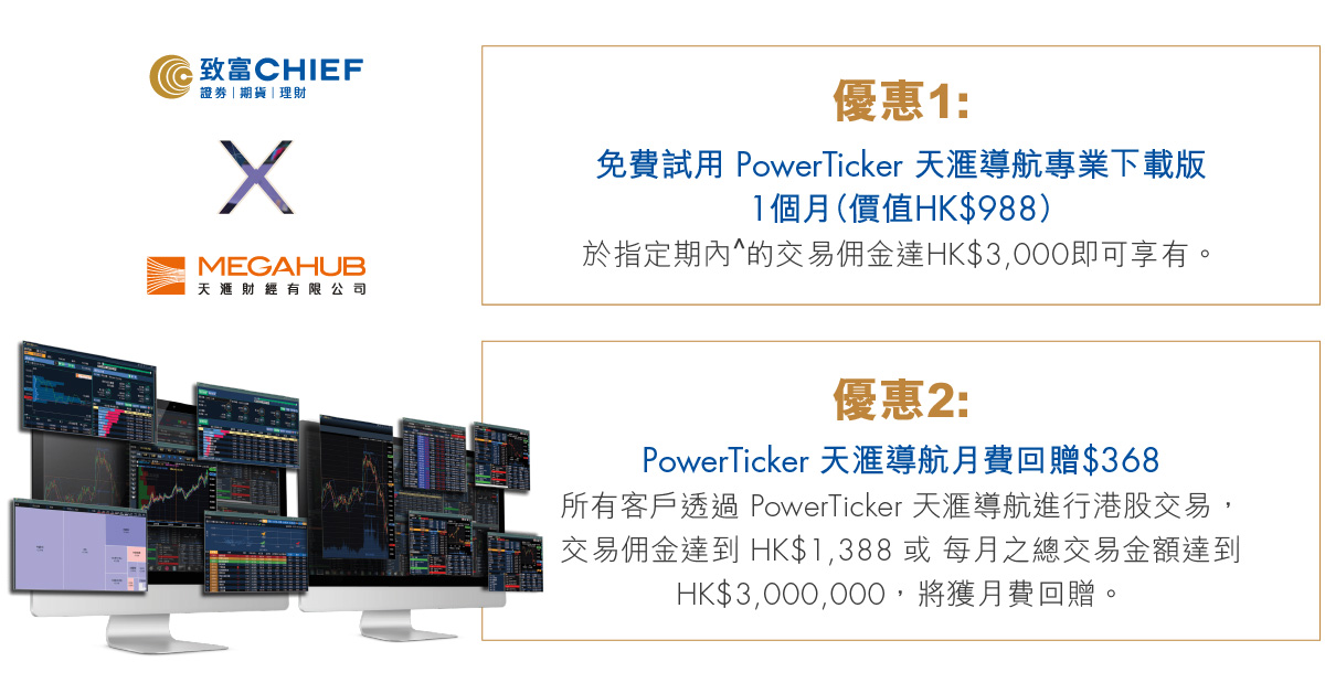 推廣期:即日至2018年3月31日 優惠受條款及細則約束 ^現有客戶須於試用「PowerTicker 天匯導航專業下載版」之登記日之前 90 日內之交易佣金達到或超過 HK$3,000,方可獲免費試用 PowerTicker 天滙導航專業下載版 1 個月。