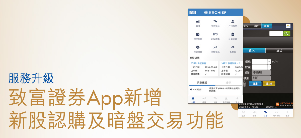 致富一直與時並進,不斷提升網絡交易服務質素,為您把握每一個投資機會。致富證券(Chief Trade)iOS手機App現已加入新股認購和暗盤交易功能。