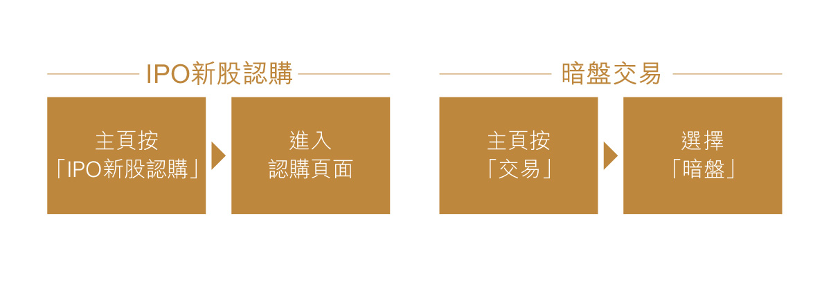 您只需於iOS手機App主頁按「IPO新股認購」,進入認購頁面,即可選擇以現金或融資認購;如想選擇「暗盤交易」,亦可於主頁按「交易」,進入頁面後選擇「暗盤」,即可進行暗盤買賣。