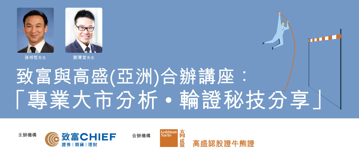 免責聲明(致富)︰以上提供之資料及內容僅供參考,並不構成任何交易、招攬、邀請或要約。投資附帶風險,投資者需注意投資項目之價值可升亦可跌,而過往之表現亦不一定反映未來之表現。金融產品買賣的虧損風險可以十分重大;因此,閣下必須仔細考慮並評估產品涉及之風險,或諮詢專業顧問,鑑於自己的財務狀況及投資目標,以確保投資決定適合個人財務狀況及風險承受水平。本公司在法律上均不負責任何人因使用本文資料而蒙受的任何或間接損失。講座活動的參加者就報名所提供的個人資料將只用作講座活動之聯絡用途。閣下有權要求查閱及更正任何閣下的個人資料,或要求本公司停止使用閣下的個人資料用於擬作出的直接促銷,如欲行使這項權利,請到本公司網頁 www.chiefgroup.com.hk「帳戶」一欄中的「表格下載」下載《個人資料收集聲明》確認書,並將已填妥及簽署的表格郵寄/傳真/親身遞交至本集團︰香港德輔道中 308 號富衞金融中心 11 樓 (傳真︰8147 2612)。