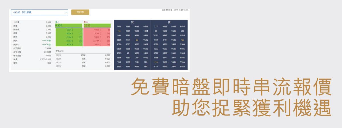 致富的網上暗盤交易服務,一直深受客戶歡迎。為使客戶在暗盤交易時更得心應手,我們已新增免費暗盤即時串流報價及圖表。客戶現可於「暗盤交易場」及「致富證券」手機App內的「暗盤報價」獲得暗盤最新行情,把握每個IPO和暗盤的投資良機。