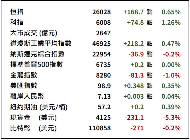 日本央行表明不急於下周加息,日圓貶值至152.17兌每美元。美滙指數則上升0.4%至98.98。 國際油市溫和上揚,紐約期油漲0.52%收報每桶57.82美元,布蘭特期油升0.51%至61.32美元。高盛指,根據IEA及美國官方資料,環球石油供應過剩跡象正浮現,預計布蘭特期油2026年底將降至每桶52美元。