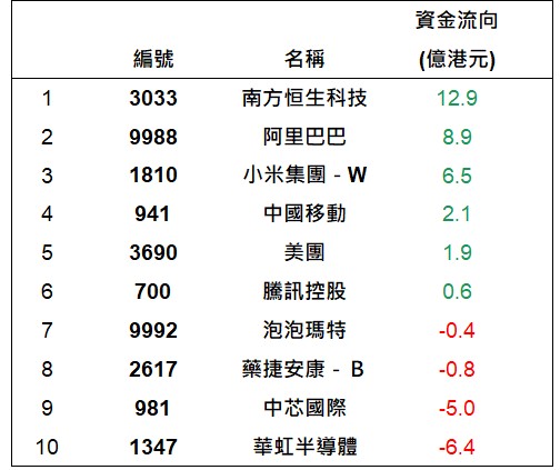 港股通上一交易日十大成交個股資金流排名